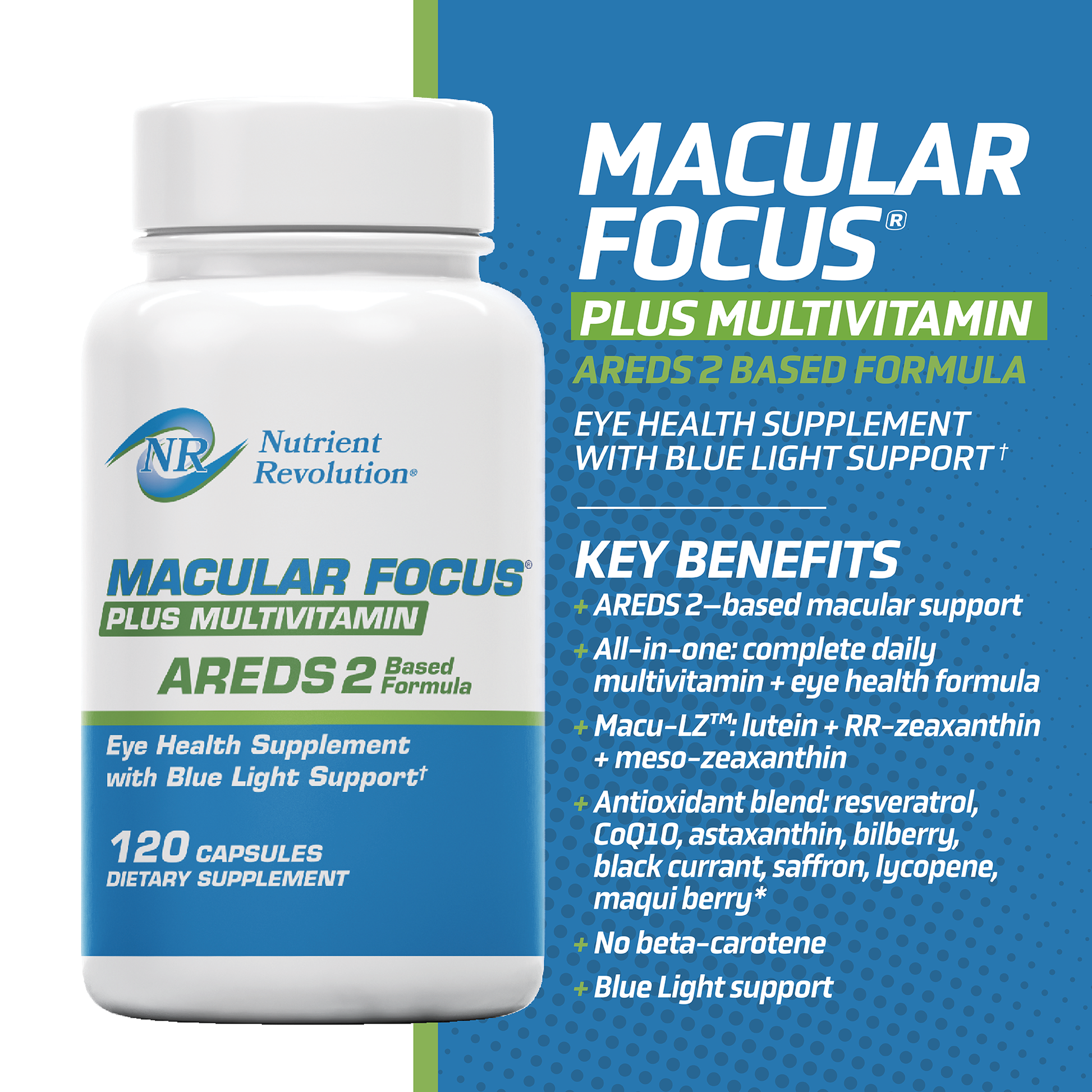 Macular Focus® features Macu-LZ™, a plant-based, non-GMO, vegetarian, gluten-free, Kosher and Halal-certified blend of lutein, RR-zeaxanthin, and RS (meso)-zeaxanthin. These macular carotenoids support eye, brain, and skin health while protecting against harmful blue light from digital screens and LED lighting. Clinical studies, including AREDS 2, demonstrate that lutein and zeaxanthin supplementation can increase macular pigment density, improve visual function, and slow AMD progression.