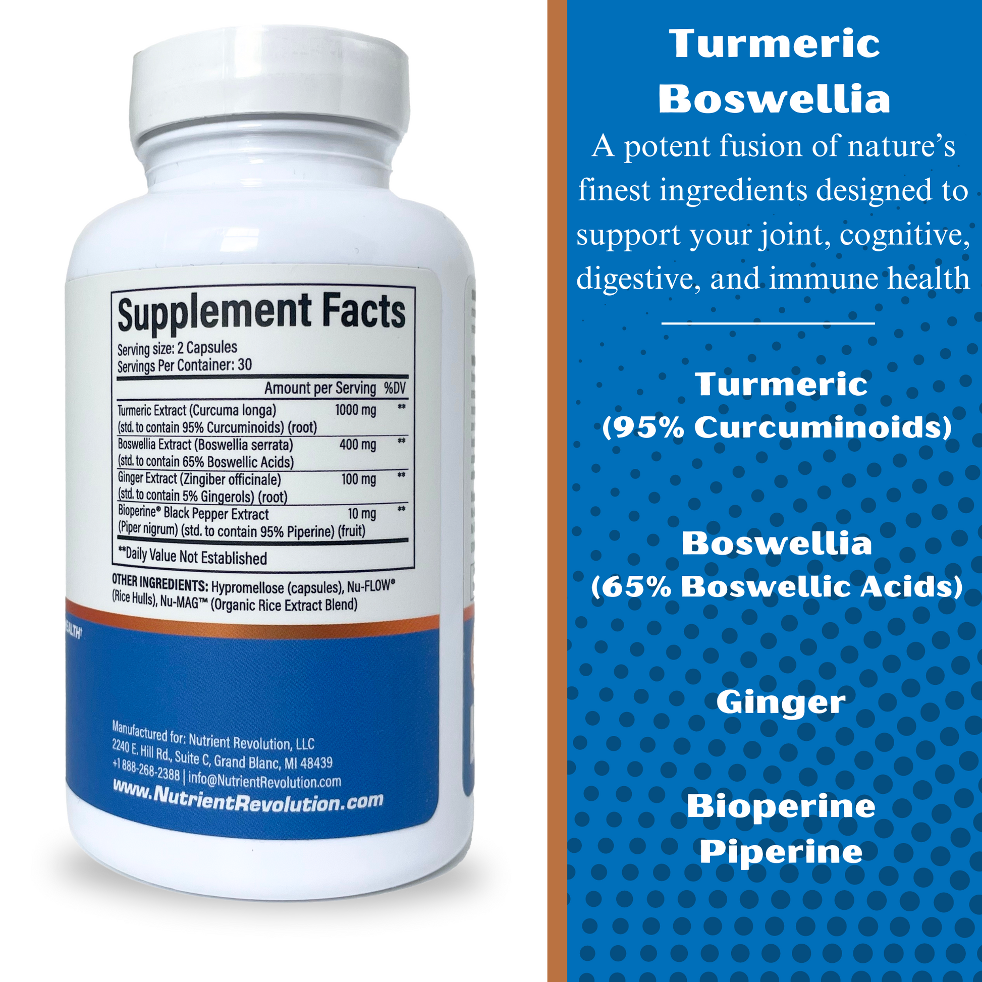 Elevate your wellness journey with Nutrient Revolution's Turmeric-Curcumin-Boswellia-Ginger-Bioperine Nutritional Supplement – a potent fusion of nature's finest ingredients designed to support your joint, cognitive, digestive and immune health.